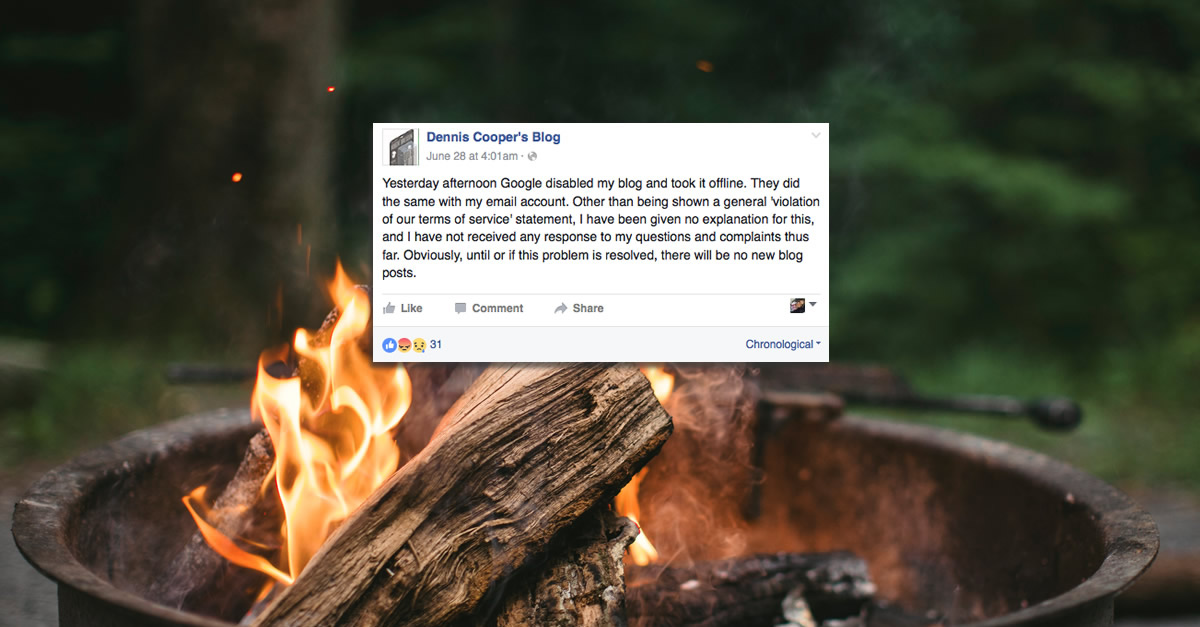 Cooper had hosted his blog on Blogger.com since 2002, only to find on June 28 that his 14 years of work had been deleted by site owner Google, with no explanation. Making matters worse, they also deleted his Gmail account.